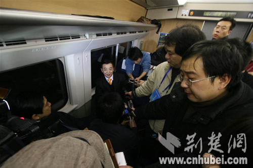 列車上,武漢鐵路局黨委書記張友松接受了記者采訪。他說,武廣高鐵充分展示了中國高速鐵路技術的最新成就,振奮了民族自信心。它的建成開通,充分證明了中國鐵路建設,尤其是高速鐵路建設發(fā)展水平已處于世界領先水平。