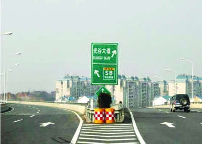 三環(huán)線由天興洲大橋往東新開發(fā)區(qū)光谷大道的一塊指路牌,左行指的是“關(guān)豹高速”,右行指的是“光谷大道”;但該路口左行是經(jīng)武黃高速去鄂州方向的,右行是經(jīng)三環(huán)線去白沙洲大橋方向的。路牌因信息不全、牌面又小,不少駕車人員到該路口時停車查看,不知行進(jìn)方向。